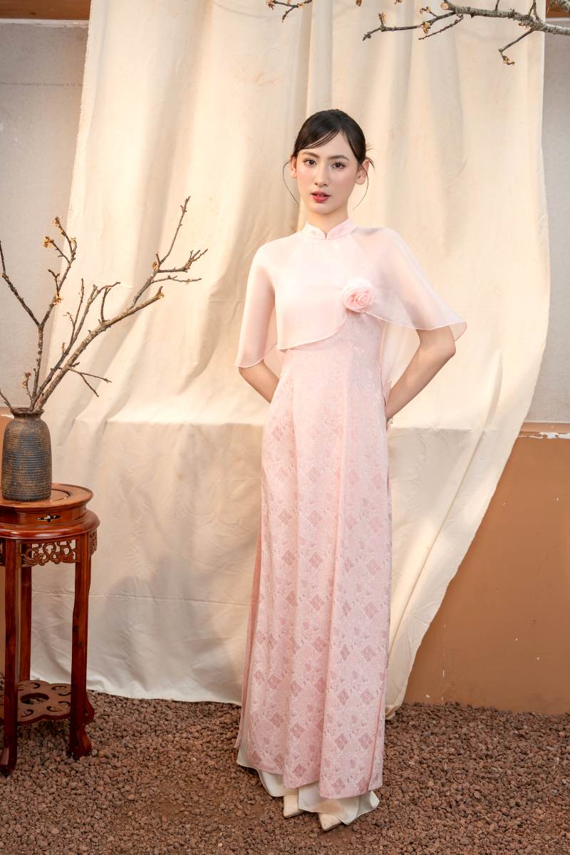 Lớp choàng voan tơ phủ ngoài mang đến độ rũ tinh khôi, giúp tà áo chuyển động nhịp nhàng theo từng bước chân. Khi lớp voan nhẹ thoáng ôm lấy bề mặt gấm lụa, hoa văn ẩn – hiện như thêu lên làn không khí, tạo cảm giác mong manh mà thanh lịch, tôn vẻ đẹp mềm dịu của người mặc.”