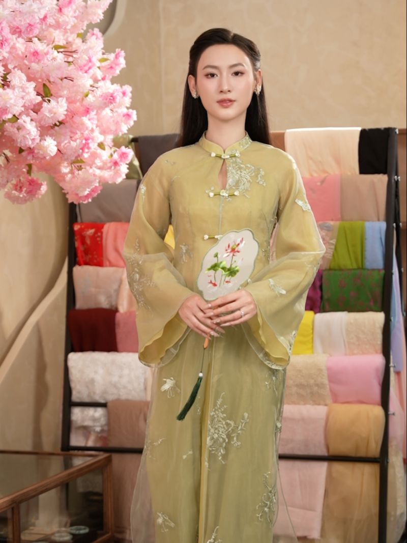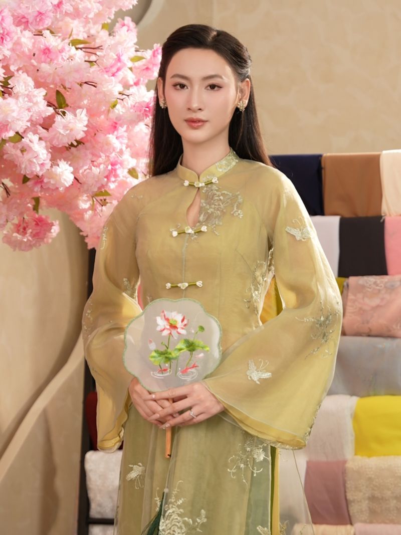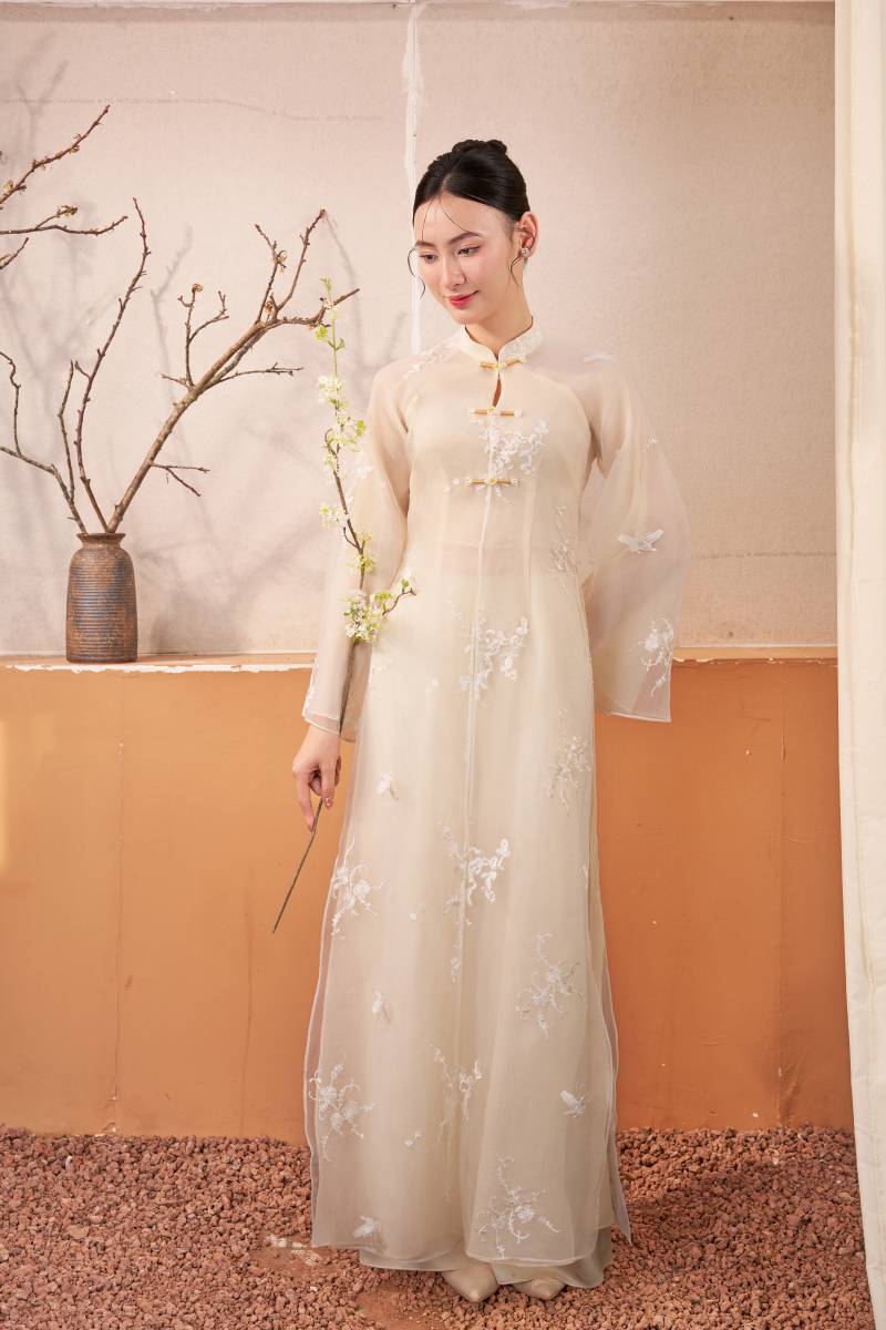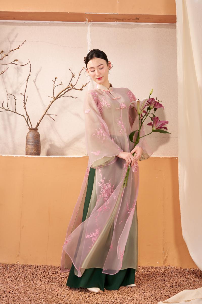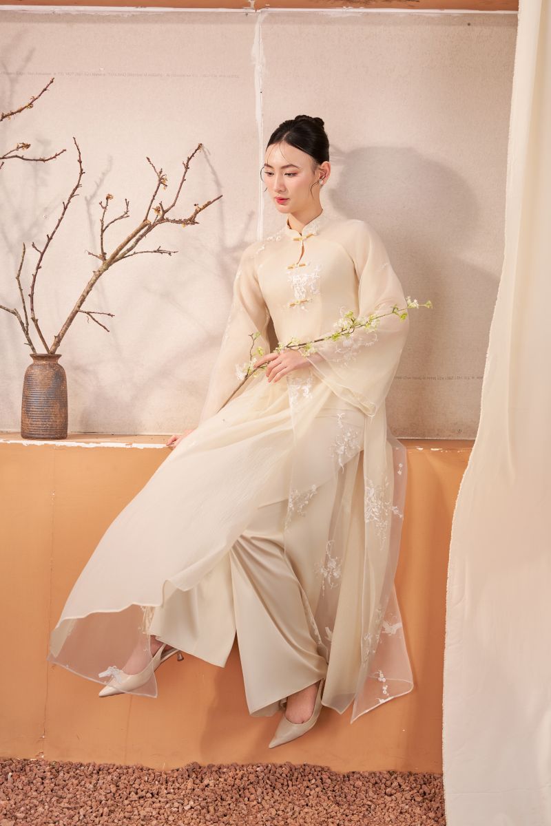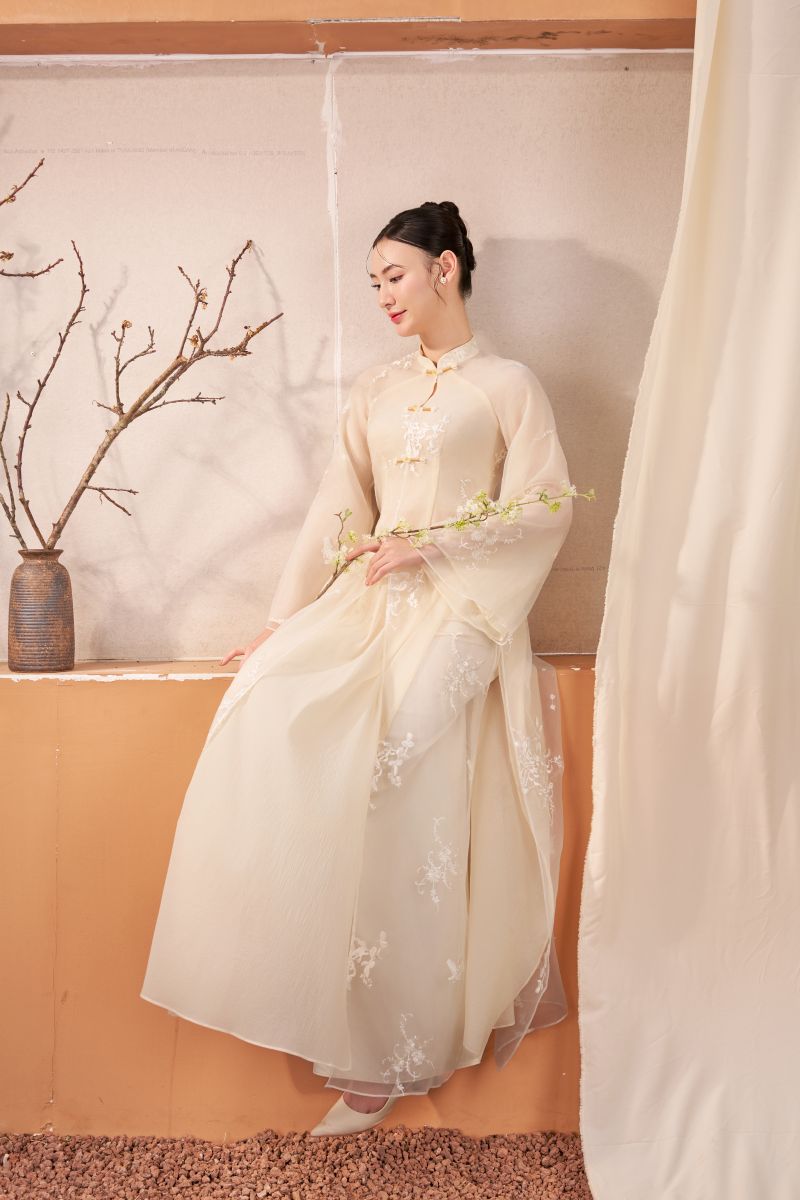 Dáng áo 4 tà xẻ giữa – một dấu ấn quen thuộc của áo dài truyền thống – được xử lý mới mẻ với tay loe mềm, nút đính thủ công và phối màu tinh giản, tạo nên vẻ đẹp hiện đại nhưng vẫn giữ được tinh thần văn hóa Việt.”